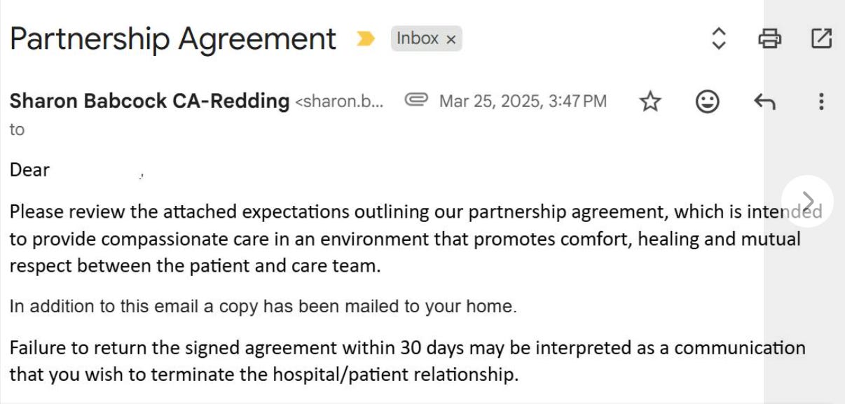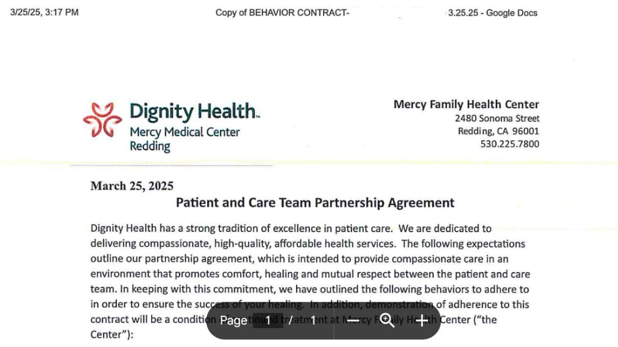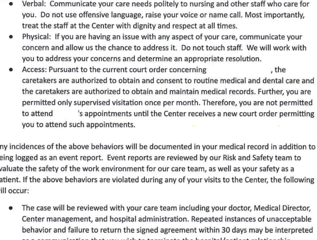 Clearly, we did not sign that humiliating retaliation stuff, and she kicked us out from the hospital denying us our medical care.