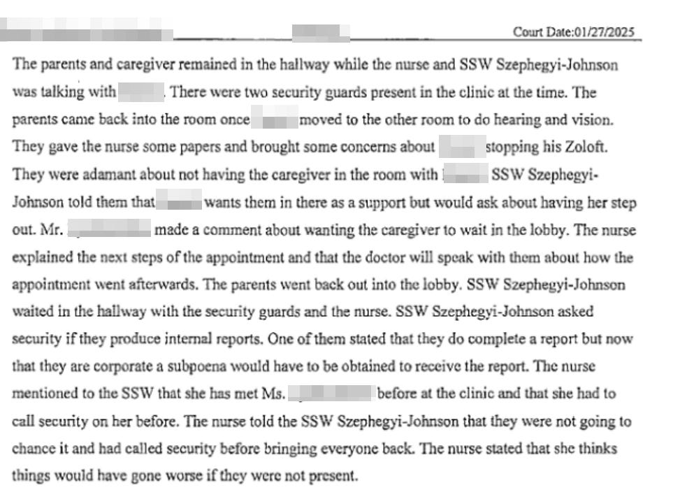 Mercy Family Center General Manager Babcock accepted lies from Szephegyi and arranged an orchestrated ambush wanting to handcuff us and make physical abysers, something that Nelson tried to do from the very beginning and failed. The entire 21 month ‘case’ was about to. It never happened. So they resorted to their neverending and ‘effective’ with the judge remedy - LIES. And by the way, I shook Babcock’s hand on that day, because I never met her before, looking at her badge, and she introduced herself as ‘General Manager’ which she in fact is. Interesting, why would she or Szephegyi/Moore need to write ‘nurse’?